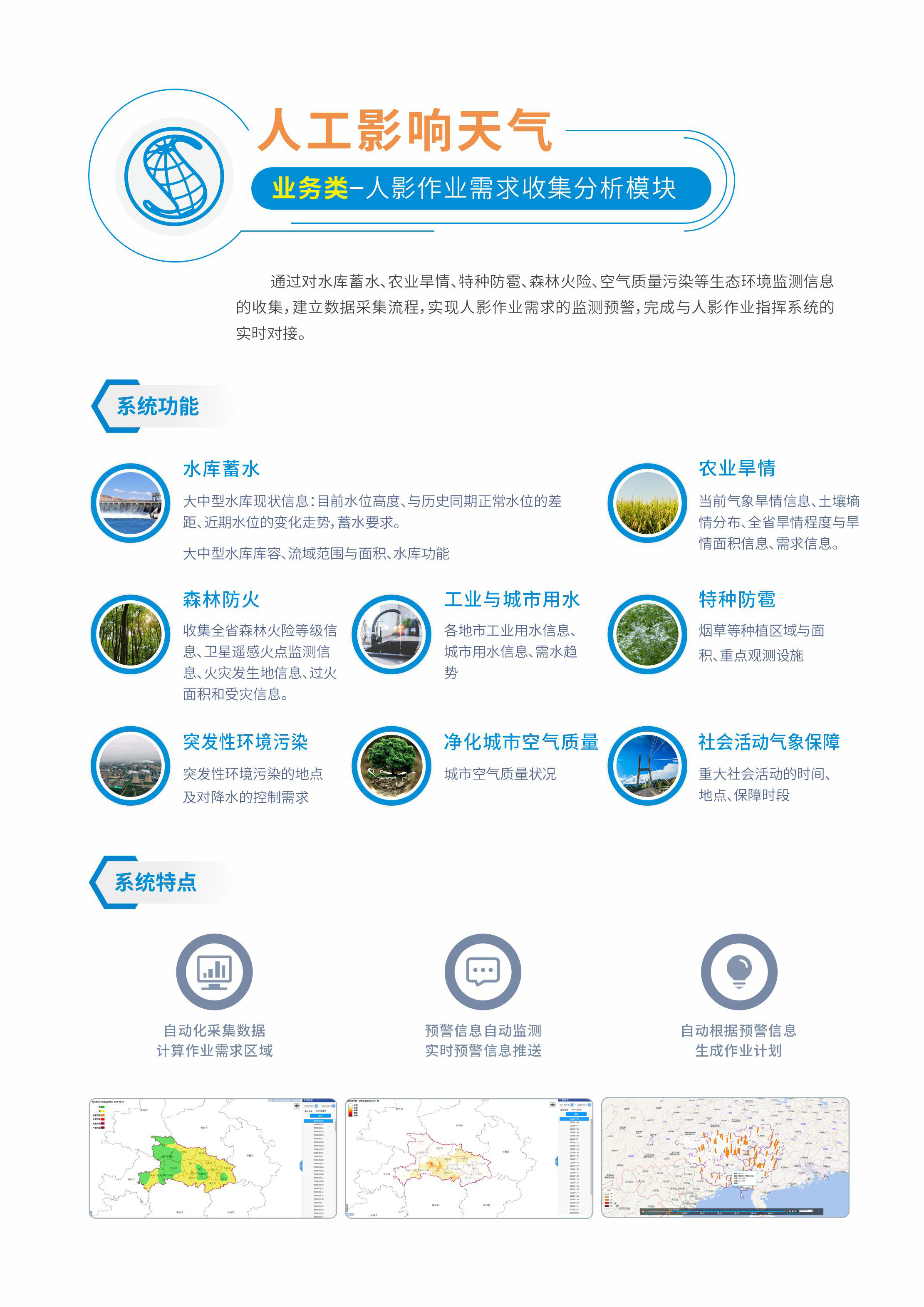 通过对水库蓄水、土壤熵情、森林火险、空气质量污染等生态环境监测信息的收 集,建立数据采集流程,实现人影作业需求的监测预警,完成与人影作业指挥系统的实时对接