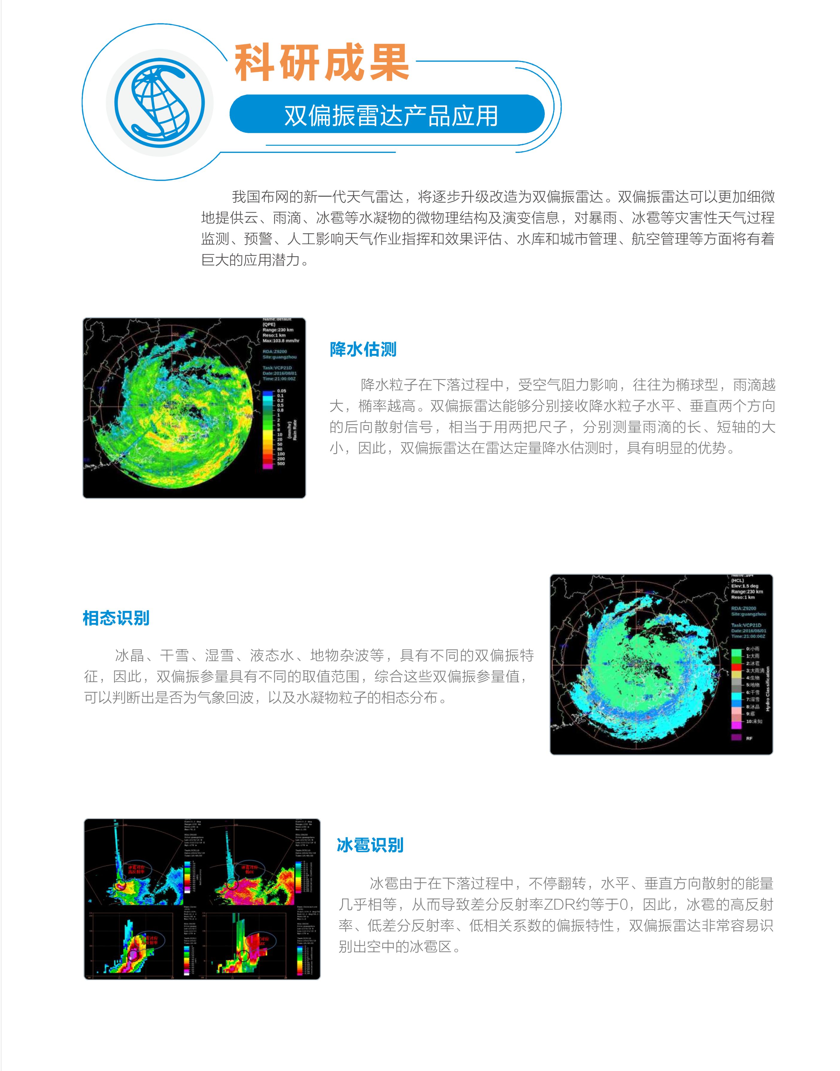 双偏振雷达可以更加细微地提供云、雨滴、冰雹等水凝物的微物理结构及演变信息,对暴雨、冰雹等灾害性天气过程监测、预警、人工影响天气作业指挥和效果评估、水库和城市管理、航空管理等方面将有着巨大的应用潜力