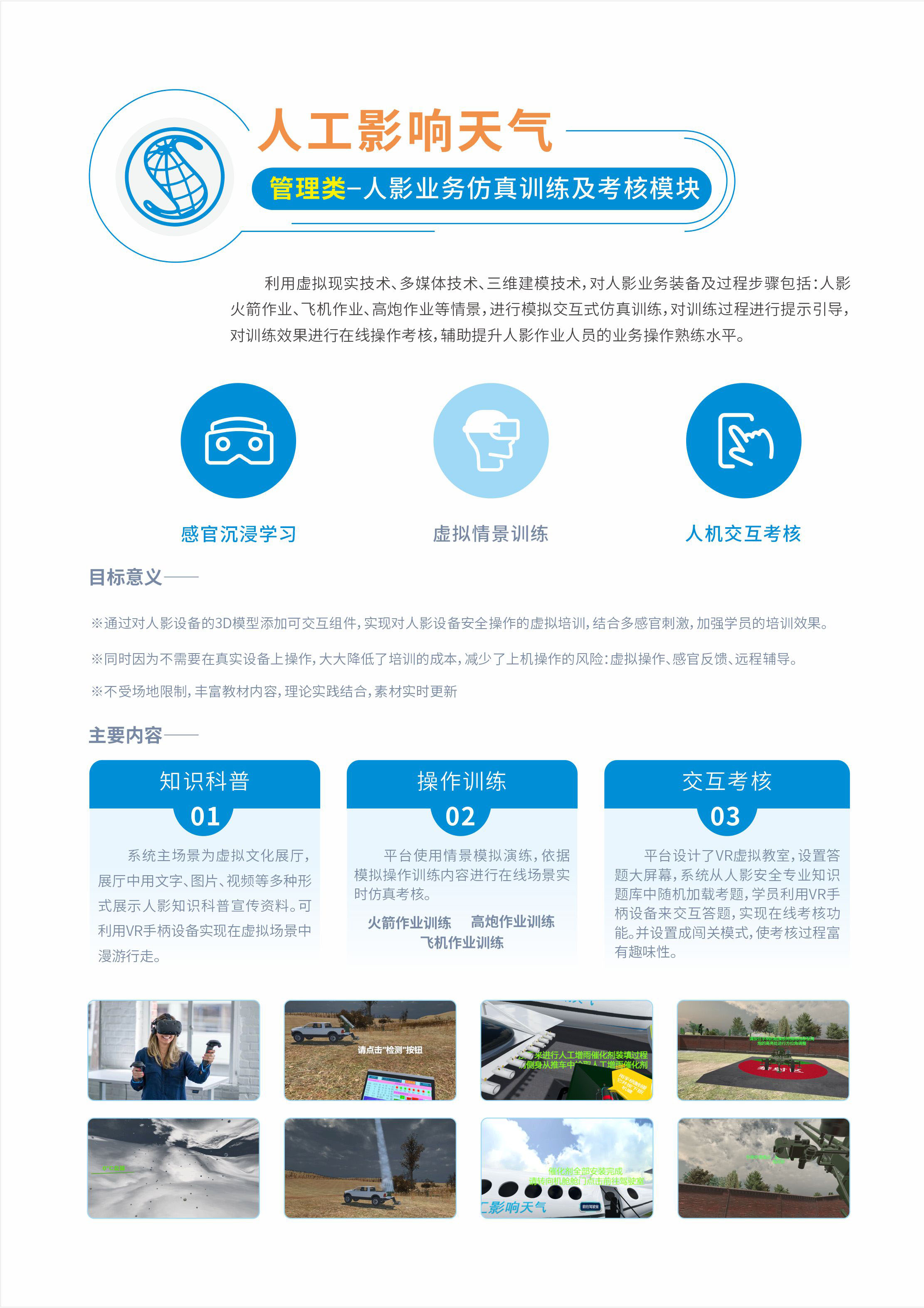 对人影业务装备及过程步骤包括: 人影火箭作业、飞机作业、高炮作业等情景,进行模拟交互式仿真训练,对训练过程进行 提示引导,对训练效果进行在线操作考核,辅助提升人影作业人员的业务操作熟练水平