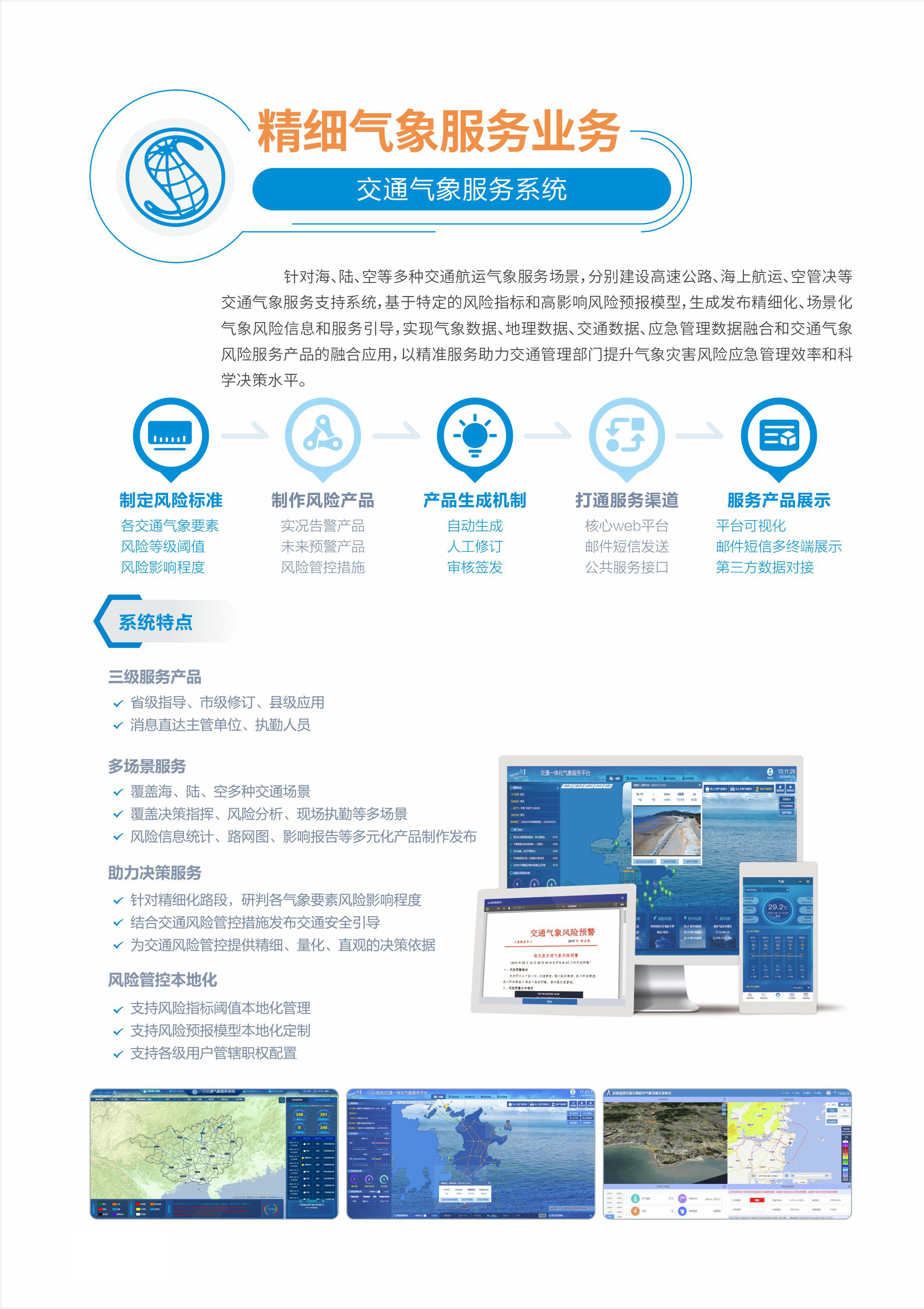 针对海、陆、空等多种交通航运气象服务场景,分别建设高速公路、海上航运、空管等交通气象服务支持系统,基于特定的风险指标和高影响风险预报模型,生成发布精细化、场景化气象风险信息和服务引导