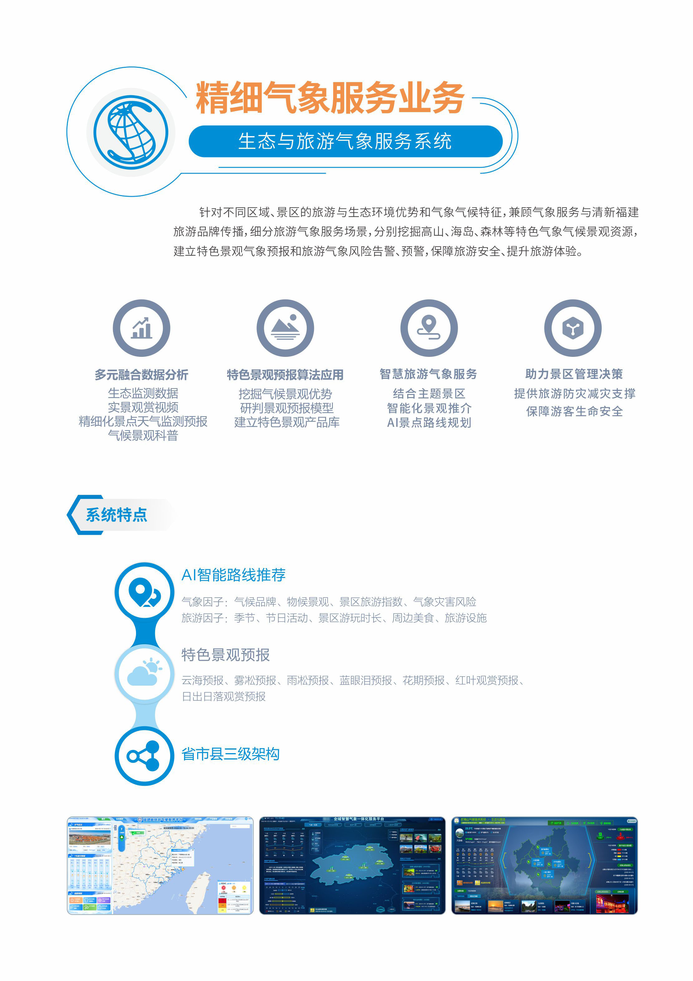 针对不同区域、景区的旅游与生态环境优势和气象气候特征,细分旅游气象服务场景,分别挖掘高山、海岛、森林等特色气象气候景 观资源,建立特色景观气象预报和旅游气象风险告警、预警,保障旅游安全、提升旅游体验