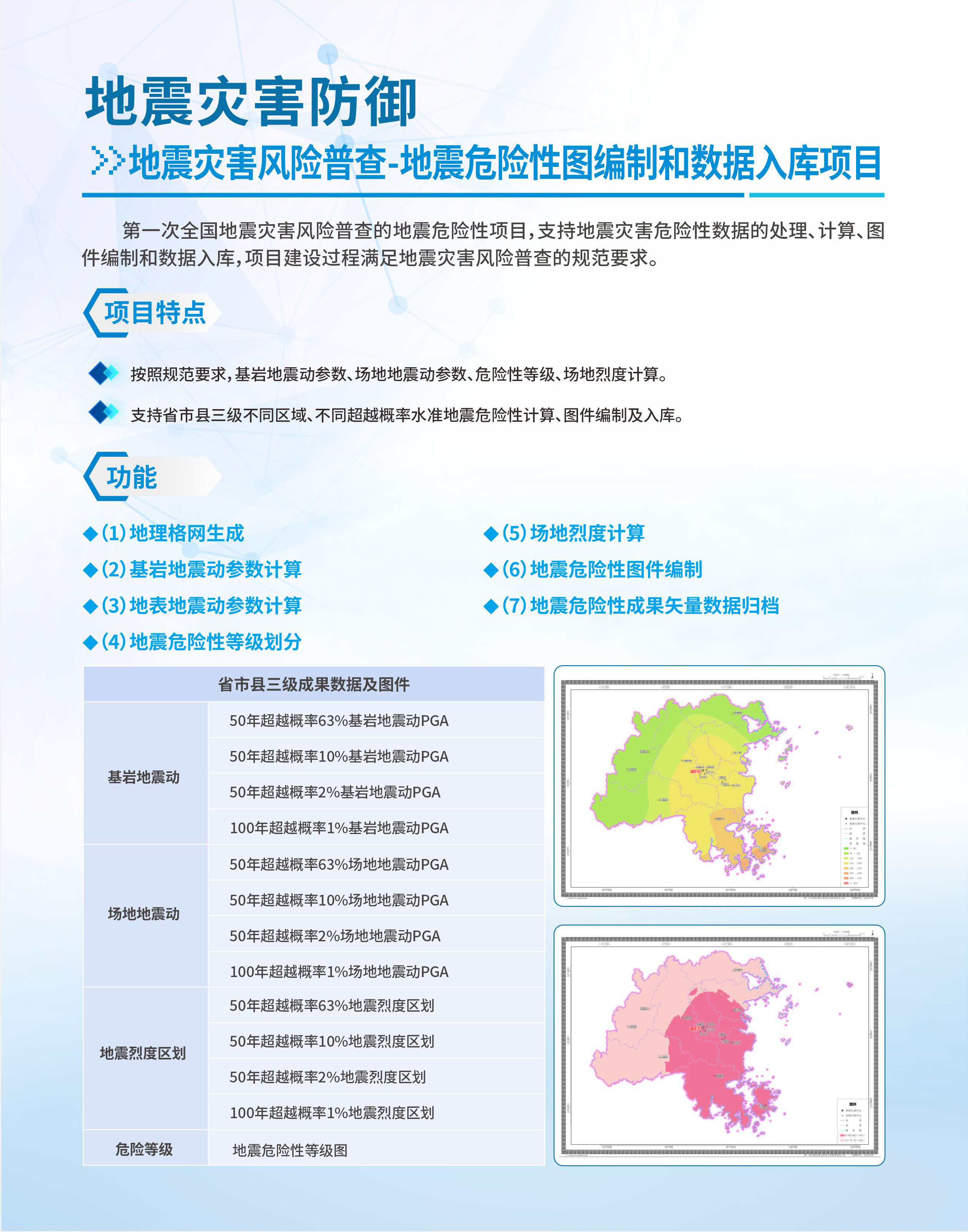 第一次全国地震灾害风险普查的地震危险性项目,支持地震灾害危险性数据的处理、计算、图件编制和数据入库,项目建设过程满足地震灾害风险普查的规范要求