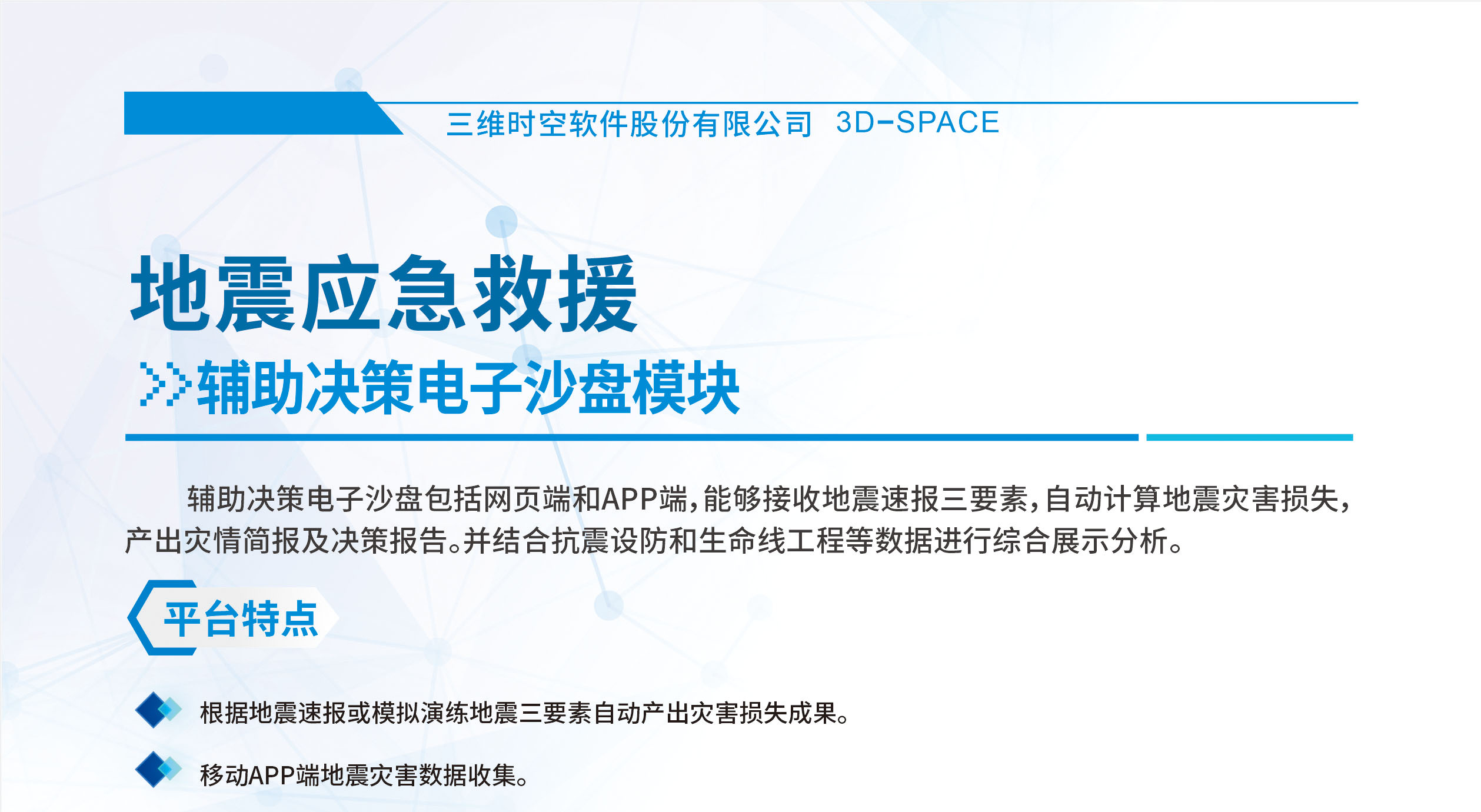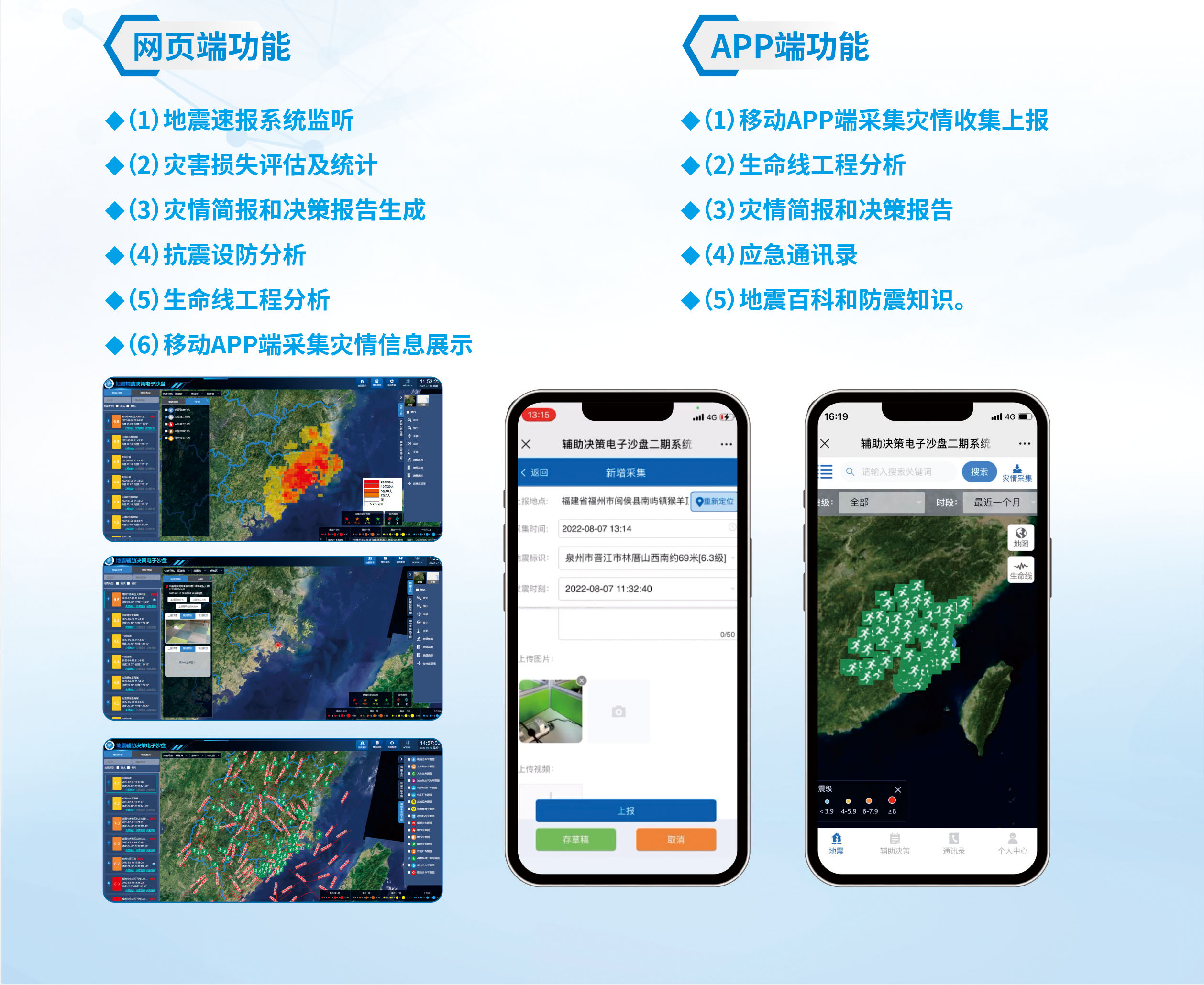 辅助决策电子沙盘包括网页端和APP端,能够接收地震速报三要素,自动计算地震灾害损失,产出灾情简报 及决策报告。并结合抗震设防和生命线工程等数据进行综合展示分析