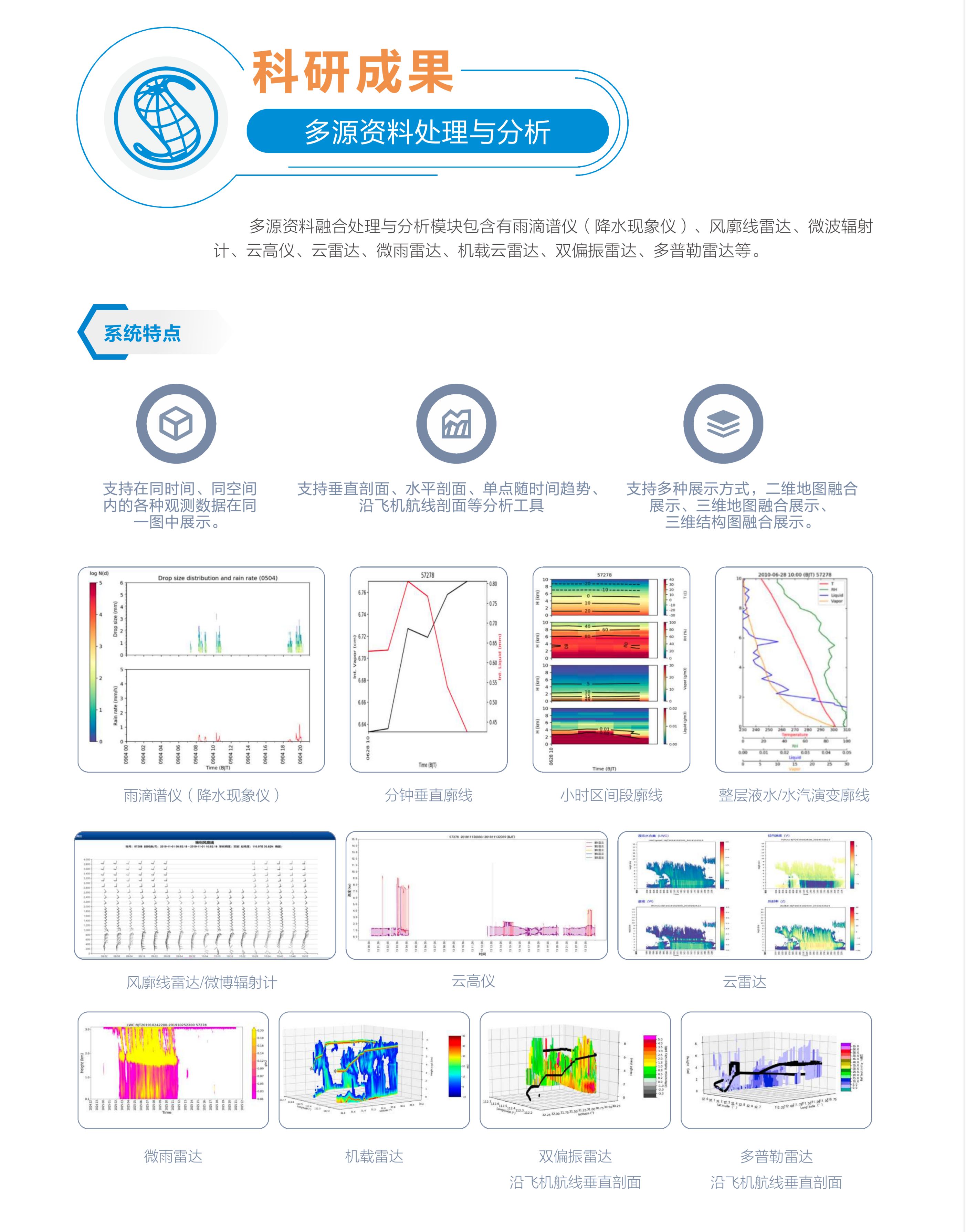 多源资料融合处理与分析模块包含有雨滴谱仪(降水现象仪)、风廓线雷达、微波辐射计、云高仪、云雷达、微雨雷达、机载云雷达、双偏振雷达、多普勒雷达等