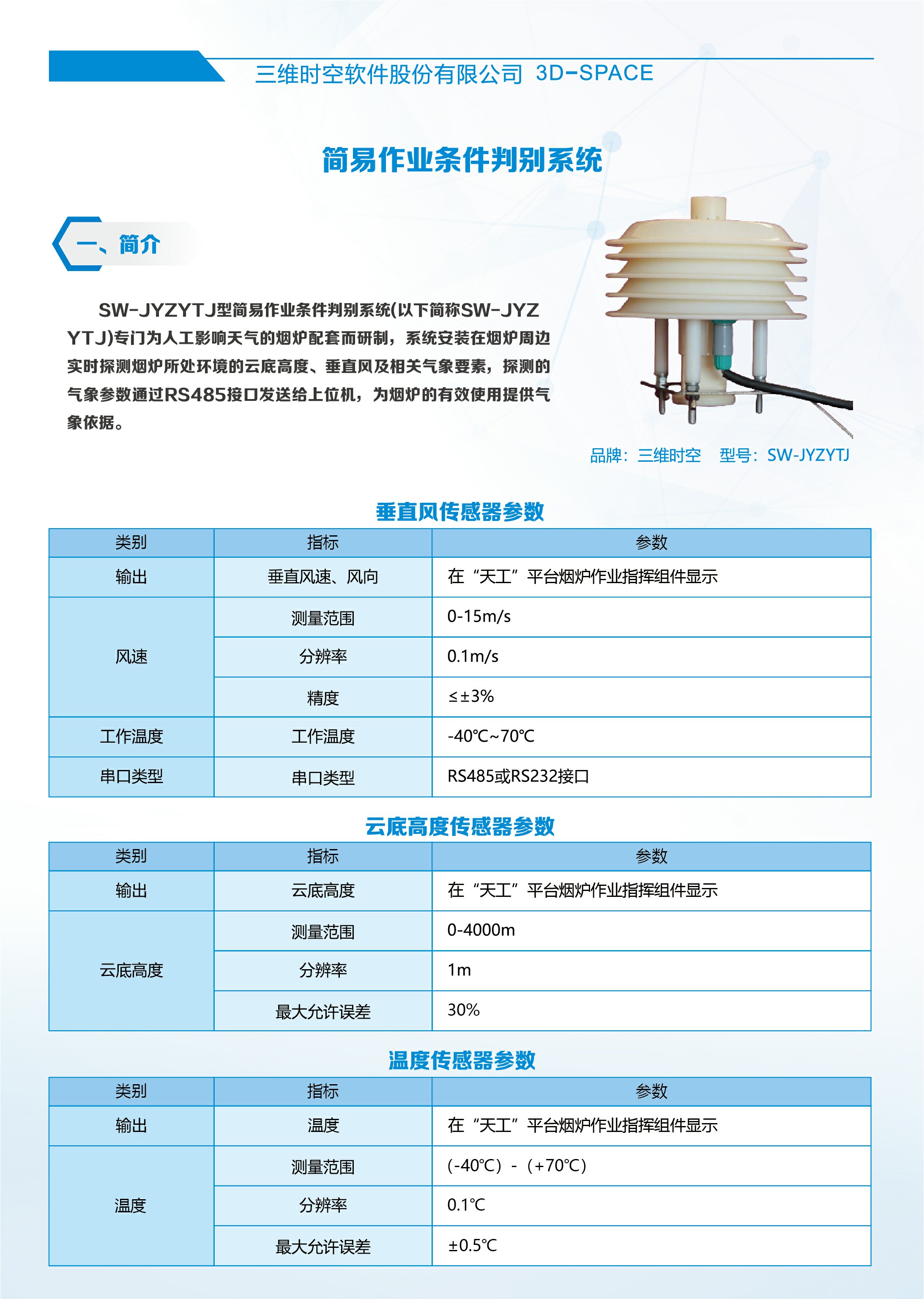 SW-JYZYTJ型简易作业条件判别系统(以下简称SW-JYZYTJ)专门为人工影响天气的烟炉配套而研制,系统安装在烟炉周边实时探测烟炉所处环境的云底高度、垂直风及相关气象要素,探测的气象参数通过RS485接口发送给上位机,为烟炉的有效使用提供气象依据