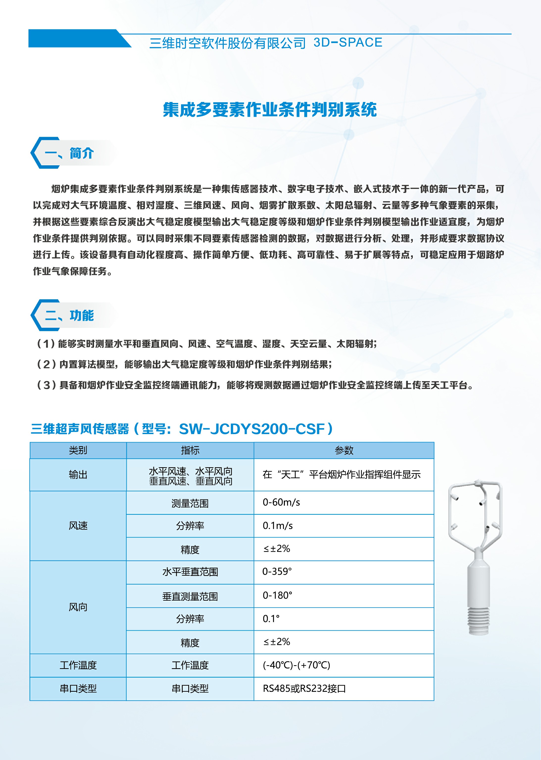 烟炉集成多要素作业条件判别系统是一种集传感器技术、数字电子技术、嵌入式技术于一体的新一代产品,可以完成对大气环境温度、相对湿度、三维风速、风向、烟雾扩散系数、太阳总辐射、云量等多种气象要素的来集,并根据这些要素综合反演出大气稳定度模型输出大气稳定度等级和烟炉作业条件判别模型输出作业适宜度,为烟炉作业条件提供判别依据。可以同时采集不同要素传感器检测的数据,对数据进行分析、处理,并形成要求数据协议进行上传。该设备具有自动化程度高、操作简单方便、低功耗、高可靠性、易于扩展等特点,可稳定应用于烟路炉作业气象保障任务
