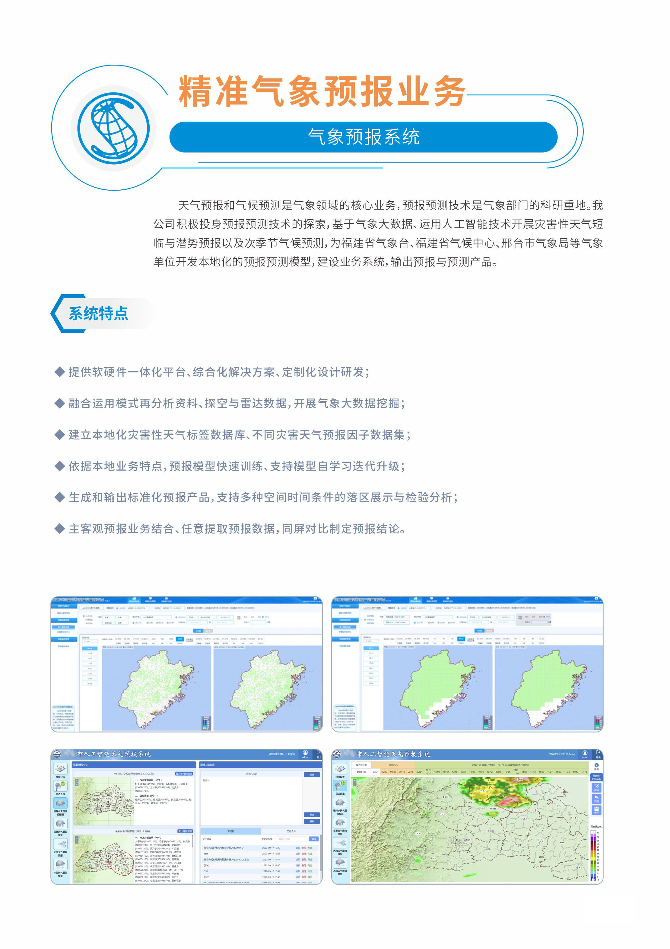基于气象大数据、运用人工智能技术开展灾害性天 气短临与潜势预报以及次季节气候预测,为福建省气象台、福建省气候中心、邢台市气象 局等气象单位开发本地化的预报预测模型,建设业务系统,输出预报与预测产品
