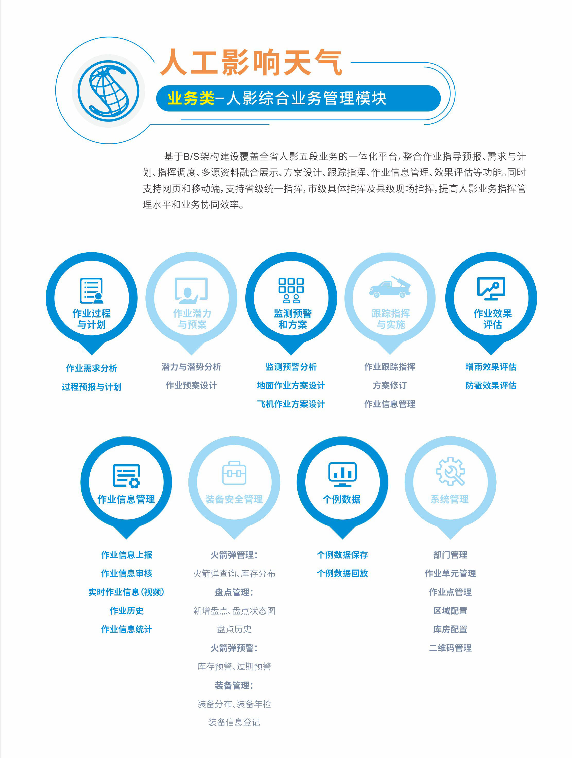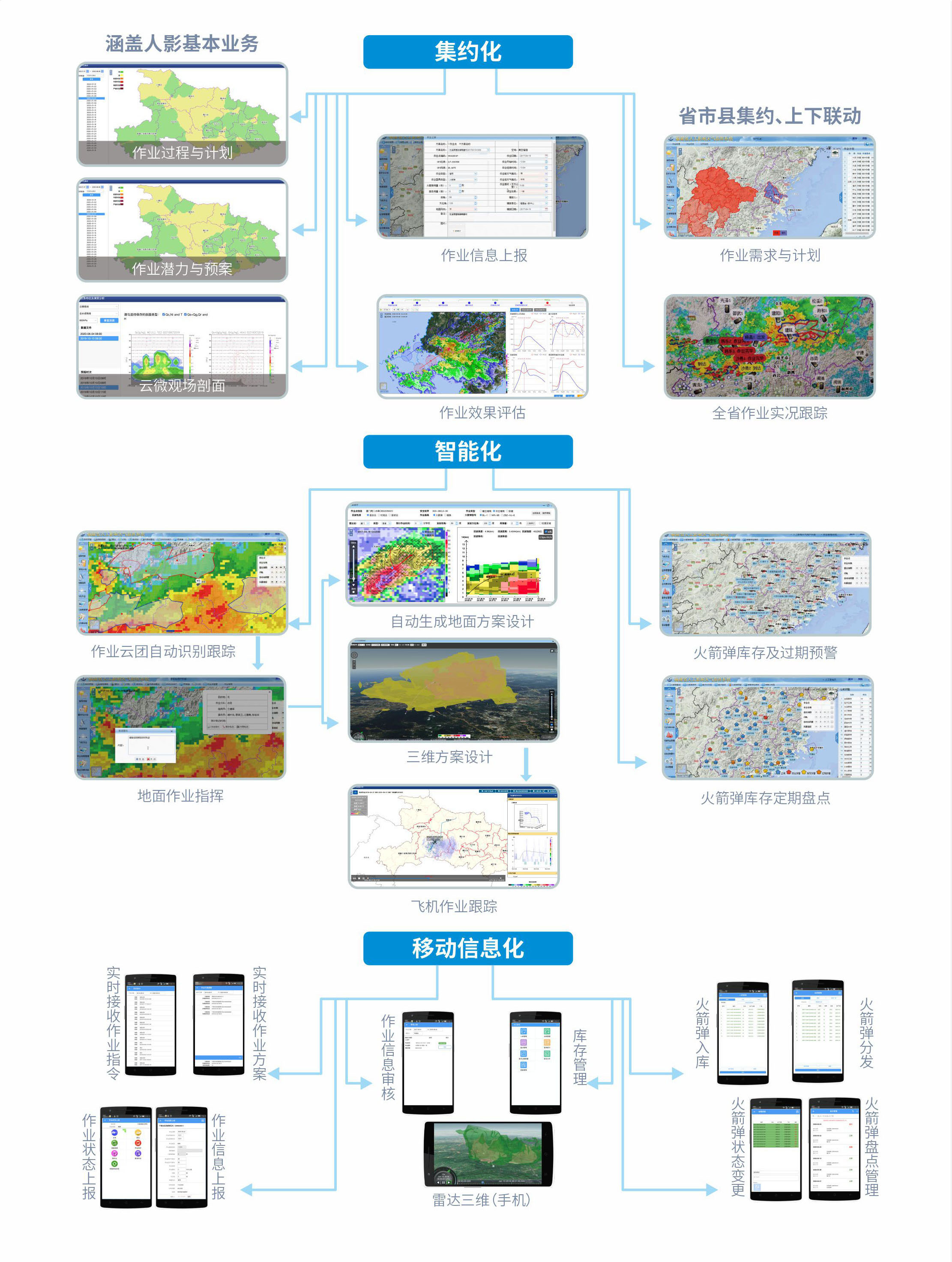 基于架构建设覆盖全省人影五段业务的一体化平台,多源资料融合展示、方案设计、跟踪指挥、作业信息管理、效果评估等功能。同时支持网页和移动端,支持省级统一指挥,市级具体指挥及县级现场指挥,提高人影业务指挥管理水平和业务协同效率