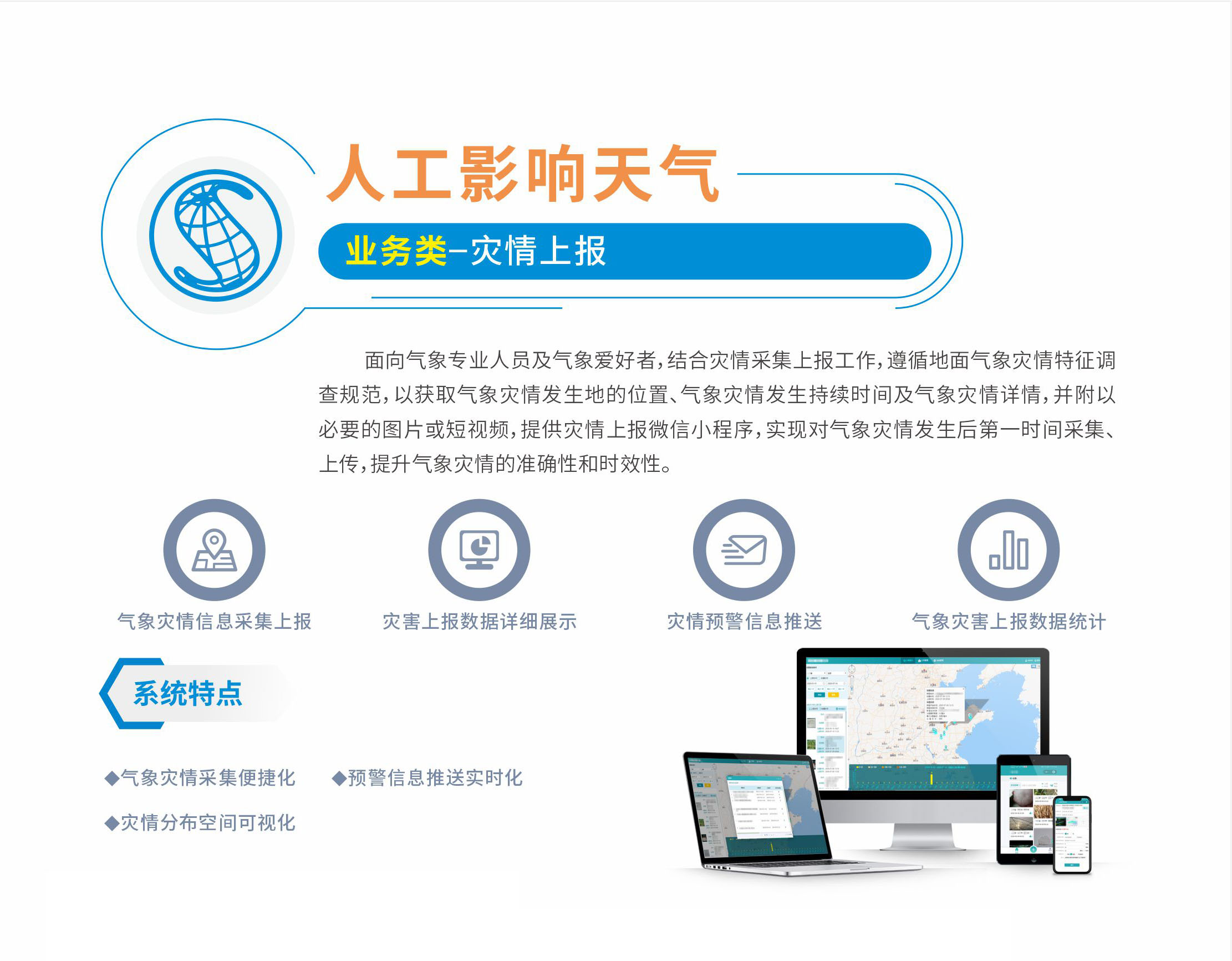 遵循地面气象灾情特征调查规范,以获取气象灾情发生地的位置、气象灾情发生持续时间及气象灾情详情,并附以必要的图片或短视频,提供灾情上报微信小程序,实现对气象灾情发生后第一时间 采集、上传,提升气象灾情的准确性和时效性