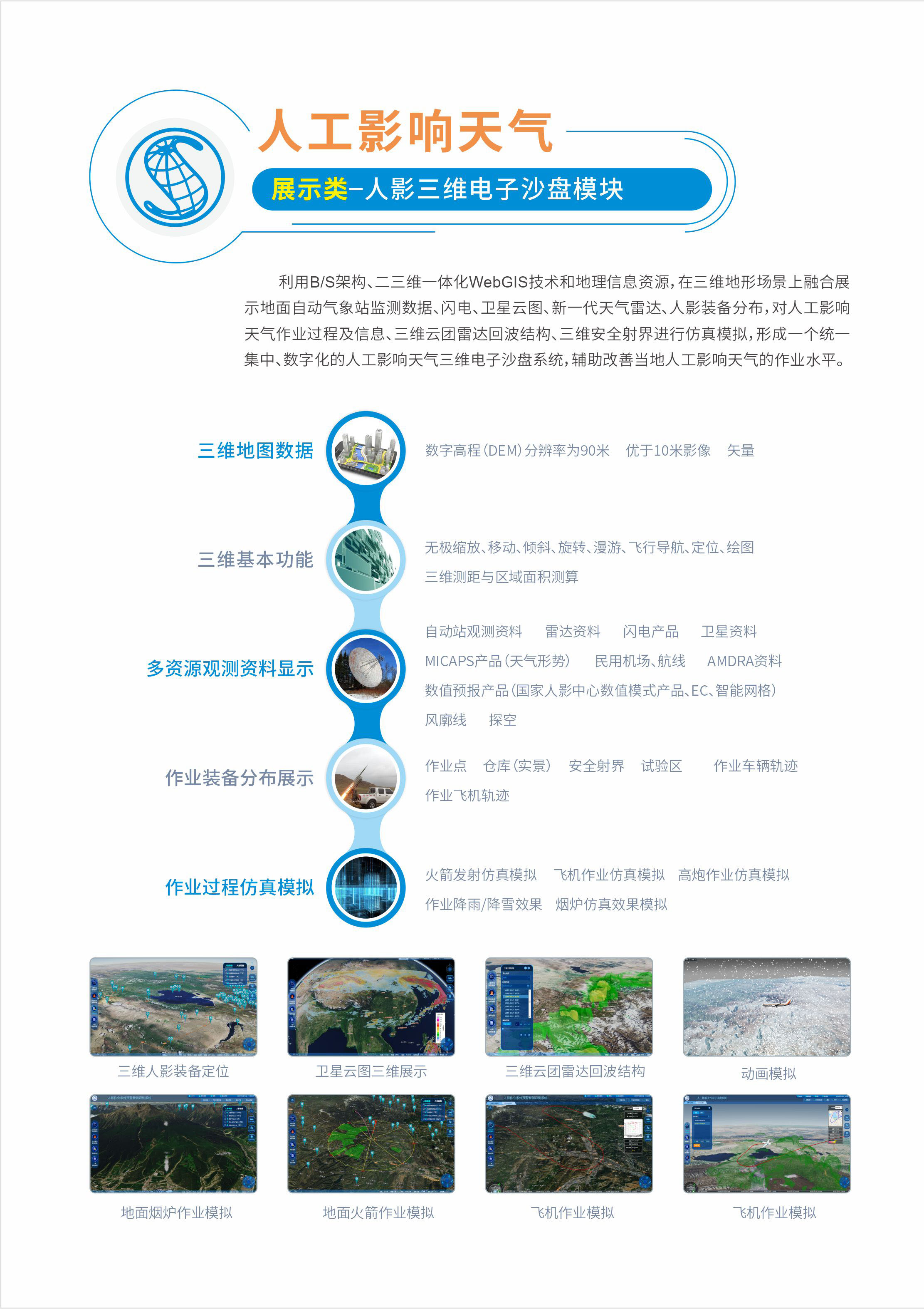 对人工影响天气作业过程及信息、三维云团雷达回波结构、三维安全射界进行仿真模拟,形成一个统一集中、数字化的人工影响天气三维电子沙盘系统,辅助改善当地人工 影响天气的作业水平